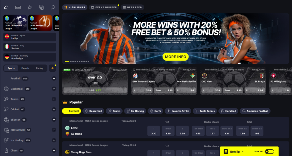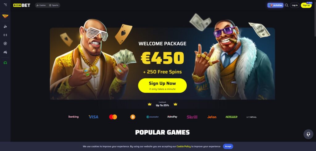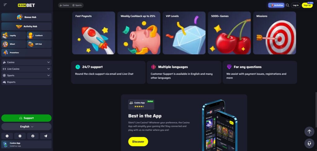 BDMBet distinguishes itself with an extensive game library, encompassing over 6,000 slots and a robust live casino section. Additionally, it captivates with unique promotional structures spanning both casino and sports betting, compounded by a rewarding VIP program accessible from account creation onward.