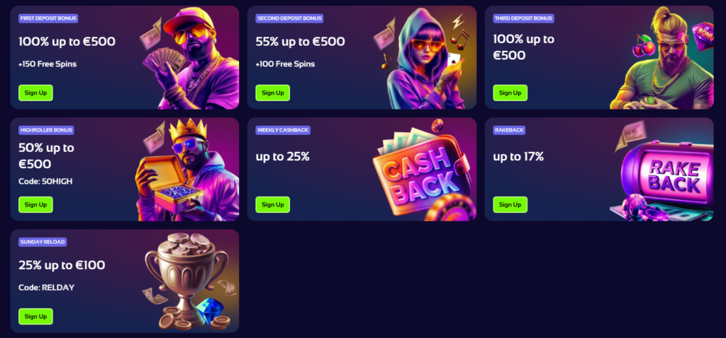 The standout welcome package includes up to €1,500 plus 250 free spins across three deposits. Each stage requires a minimum deposit (typically €20, or €300 for high roller bonuses) and is subject to a 35x wagering requirement on both funds and spins. High rollers benefit from personalized codes and exclusive deals, while weekly cashback ensures ongoing perks even during less successful sessions.