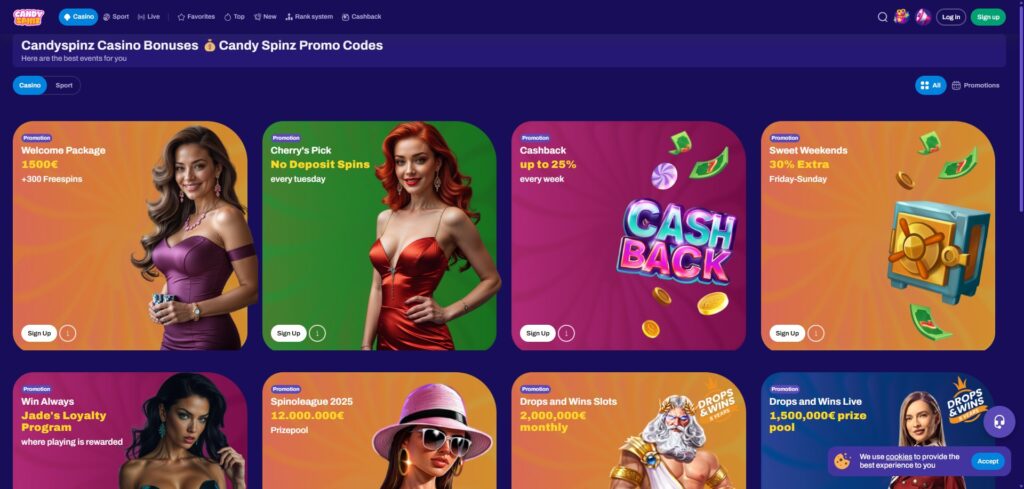 One of CandySpinz’s main strengths lies in its generous bonus offers, designed to provide players with better value during their first deposits. Registration comes with a substantial welcome package, multiplying winning opportunities right from the start of the user experience.