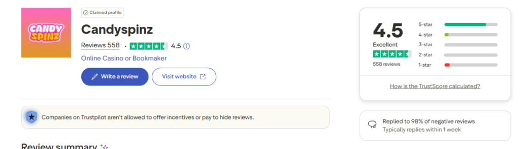 The biggest question every player has: “Will I get my winnings?” We looked at CandySpinz‘s Trustpilot page to find the answer, and the results are reassuring.