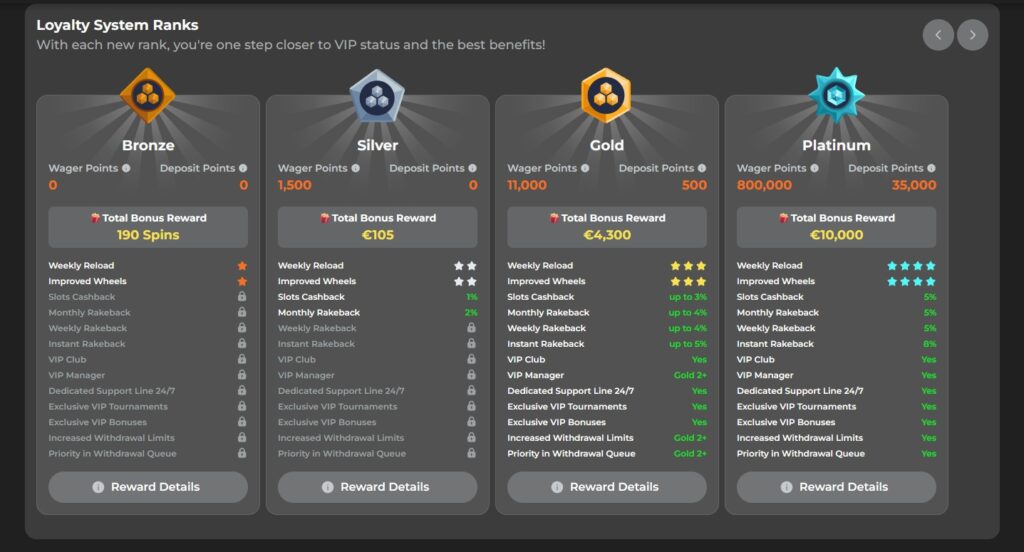 - 🥇 Gold: Priority cashouts, €4,300 bonus, bi-weekly events