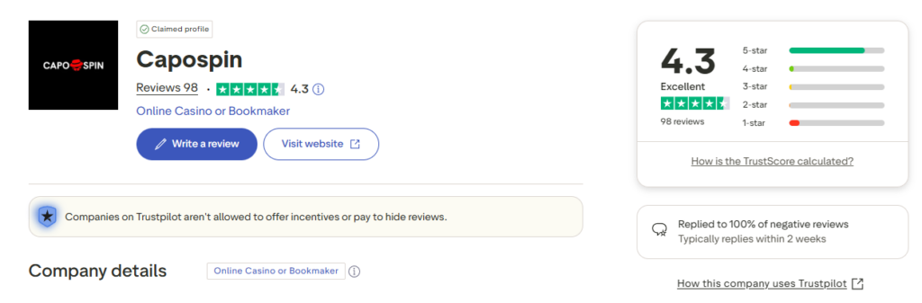 We believe numbers don’t lie. To give you an unbiased view of Capospin, we analyzed their current standing on Trustpilot, the leading review platform.