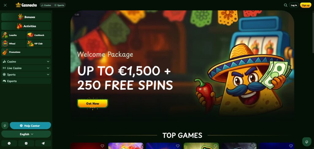 Upon arrival, Casinacho greets visitors with a bold black-and-green aesthetic. The cheerful mascot injects a playful spirit, giving the site a unique personality that sets it apart from typical online casinos. This distinctive visual identity is matched by thoughtful usability choices throughout the interface.