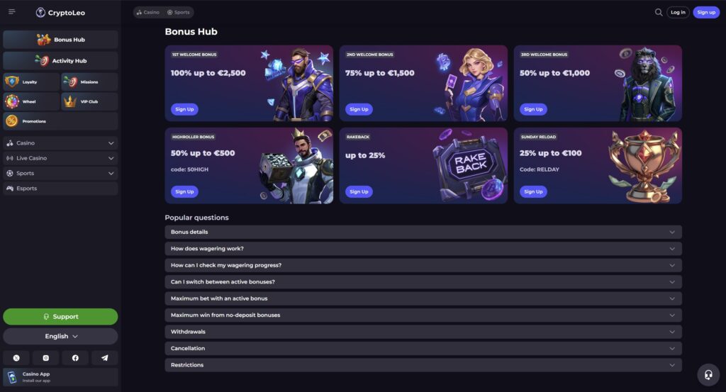 Cryptoleo goes beyond just welcome and highroller bonuses by offering a comprehensive VIP program accessible to all registered members. This program allows players to earn rewards and enjoy various perks as they progress through loyalty levels.