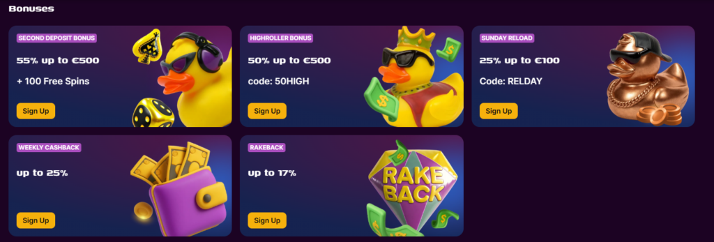 Duckysino takes player rewards seriously by filling its promotional calendar with frequent offers throughout each week and month. New arrivals benefit from a multi-stage welcome package, while loyal customers enjoy continued perks through reloads, cashback, and creative campaigns.