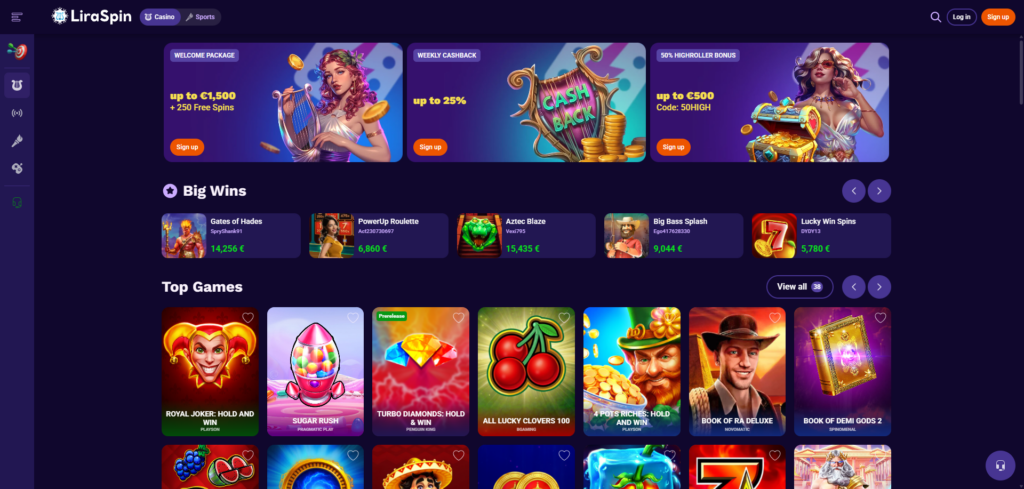 LiraSpin’s website presents a straightforward design, decked out in shades of purple that make navigation intuitive. Once you land on the homepage, highlights of top games and notable wins immediately catch your eye. Moving through various sections is a breeze, whether exploring sportsbooks or diving into casino games.