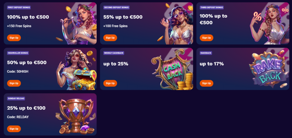 The first deposit fetches a 100% match up to €150 along with 150 free spins. Subsequent deposits are equally rewarding, with a second deposit promising a 55% match up to €150 plus 100 free spins, followed by a third deposit providing another 100% match up to €150.