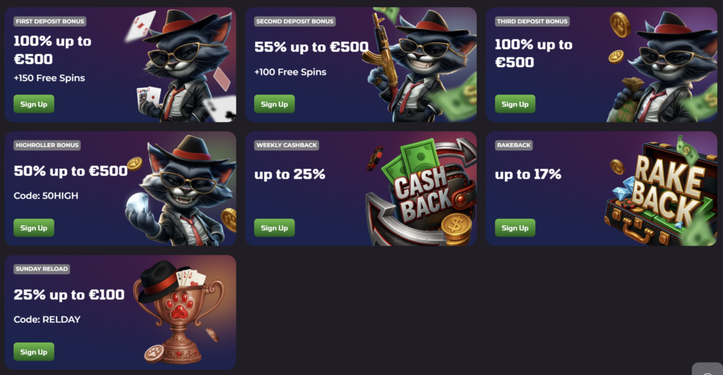 Luckycapone places strong emphasis on rewarding both new and loyal members. Right from the start, an attractive welcome package awaits: up to €450 in cash bonuses and a generous 250 free spins, offering plenty of opportunity to explore and win extra prizes.