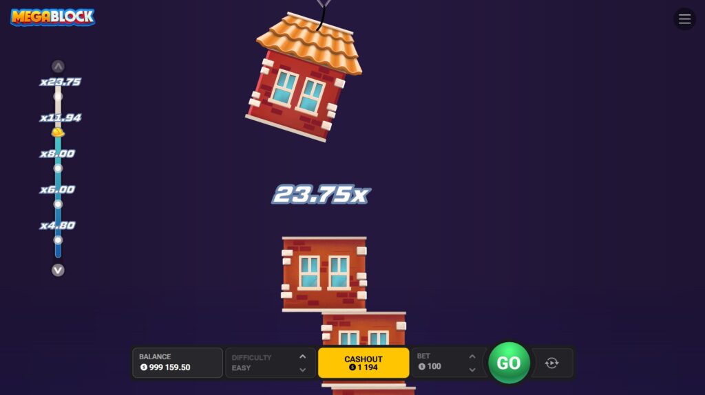Configure your stake between $0.10 and $100.00 easily. You can find MegaBlock in the casino lobby under “Instant Games.” Adjust your settings before placing the first block.