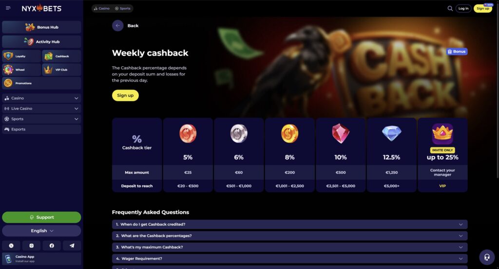 - 🔄 Cashback bonus: Recover up to 25% of losses, providing some peace of mind.