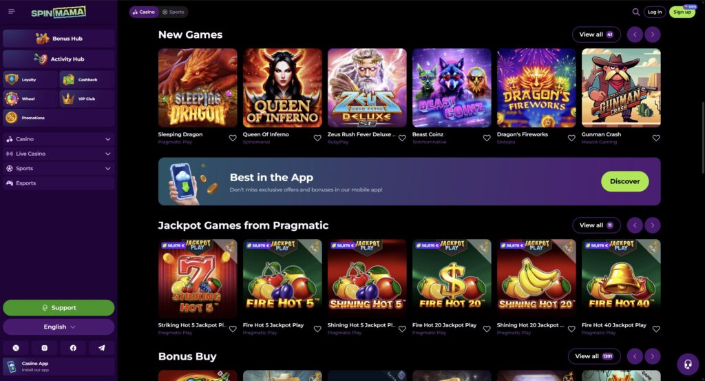Spinmama presents an impressive variety of over 6,000 games including slots, table games like blackjack and roulette, as well as engaging live casino experiences. These games come with varying themes and features, appealing to a broad audience of gaming enthusiasts.