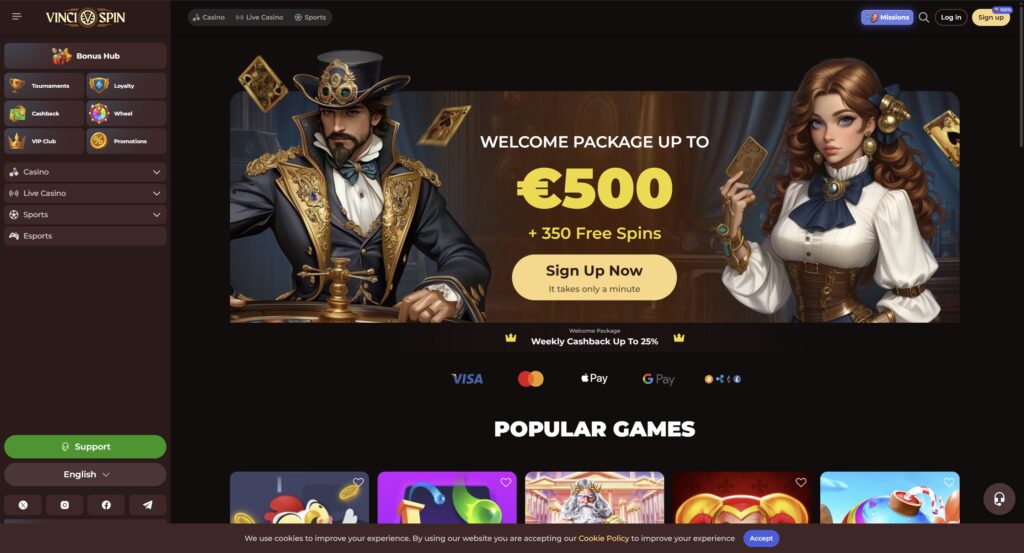 To enable smooth financial interactions, Vinci Spin recommends methods with minimal fees, ensuring players retain more of their hard-earned gains.
