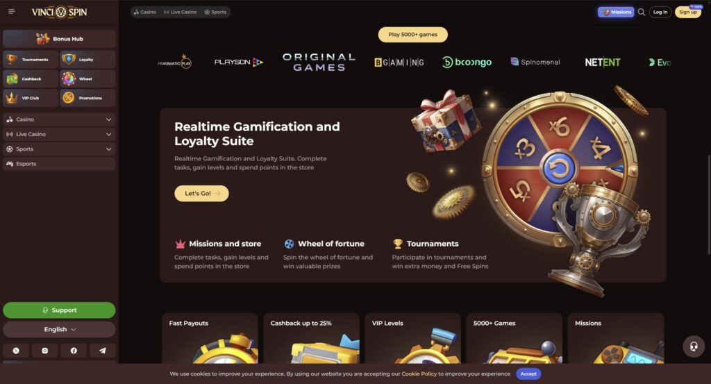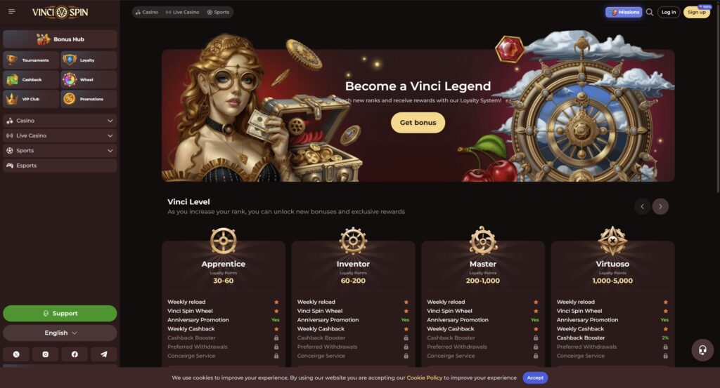 The loyalty program stands as a testament to Vinci Spin’s dedication toward rewarding regular users. Significant features include a weekly cashback opportunity of up to 10%, tailored recharge bonuses, and additional spins designed to fit individual player profiles.