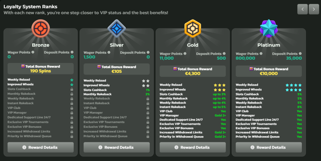 The welcome package stands out for its size and multi-phase design. After completing the registration process, members can claim several deposit-match offers paired with free spins, giving extra chances to win from the very beginning. High-volume players benefit from special bonuses designed for larger deposits, while frequent visitors enjoy weekly reload deals and cashback opportunities.